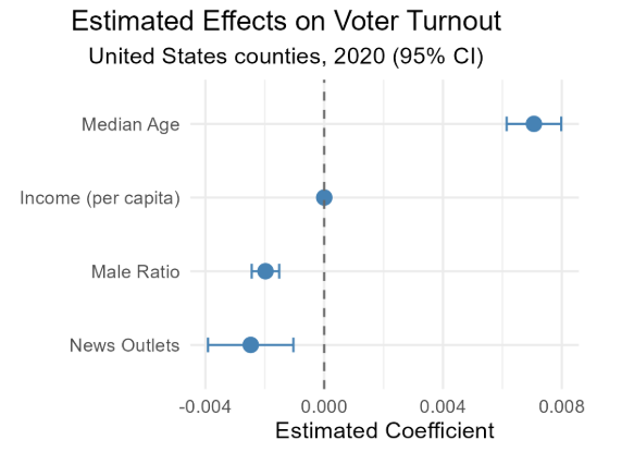 This graph showcases the confidence intervals of multiple independent variables in comparison to voter turnout. Although they aren’t all on the same scale, it is interesting to see which ones fall on which side of the line, potentially indicating other bigger factors at play than a lack of local news coverage. It showcases that simply increasing the number of news outlets in a region will not necessarily have the desired effect, but that we should look beyond to other factors and more heavily consider the quality of reporting.