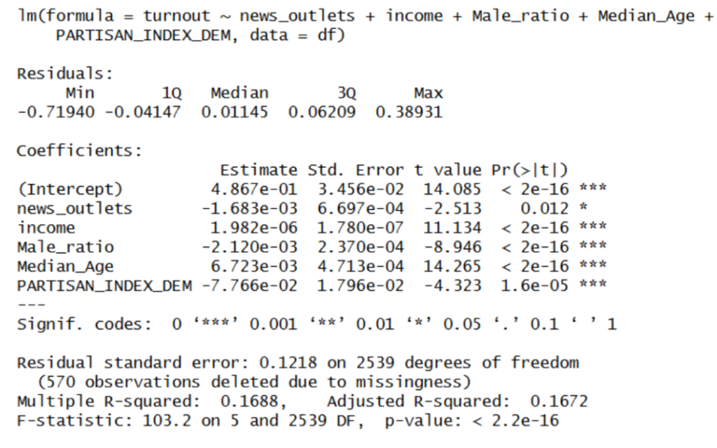 The model I used was a multivariate ordinary least squares (OLS) regression with voter turnout as the dependent variable, regressed on the number of news outlets and other control variables (income, median age, gender breakdown, etc.). This analysis would not be able to determine causality as there is no way to randomly apply treatments to different counties. There is also no way to rule out reverse causality, such as politically active counties supporting more local newspapers, or potentially omitting an important control variable, consequentially, the results will only establish a correlation between the variables, not a causal relationship.